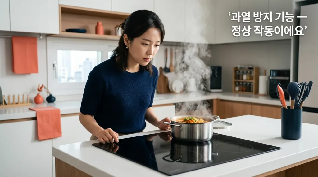 💡 팁: 인덕션 하단 통풍구(냉각팬 출구)가 막혀 있으면 과열이 빨리 돼요. 인덕션 주변에 물건을 쌓아두지 마세요.