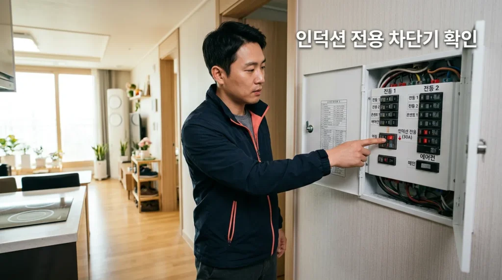 분전반을 열고 인덕션용 차단기가 올라가 있는지 먼저 확인해요.