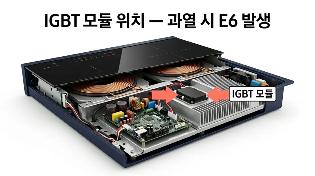 IGBT 과열 E6는 인덕션 사용 30분 이상 후 고화력(강·센 단계) 연속 사용 시 자주 발생해요.