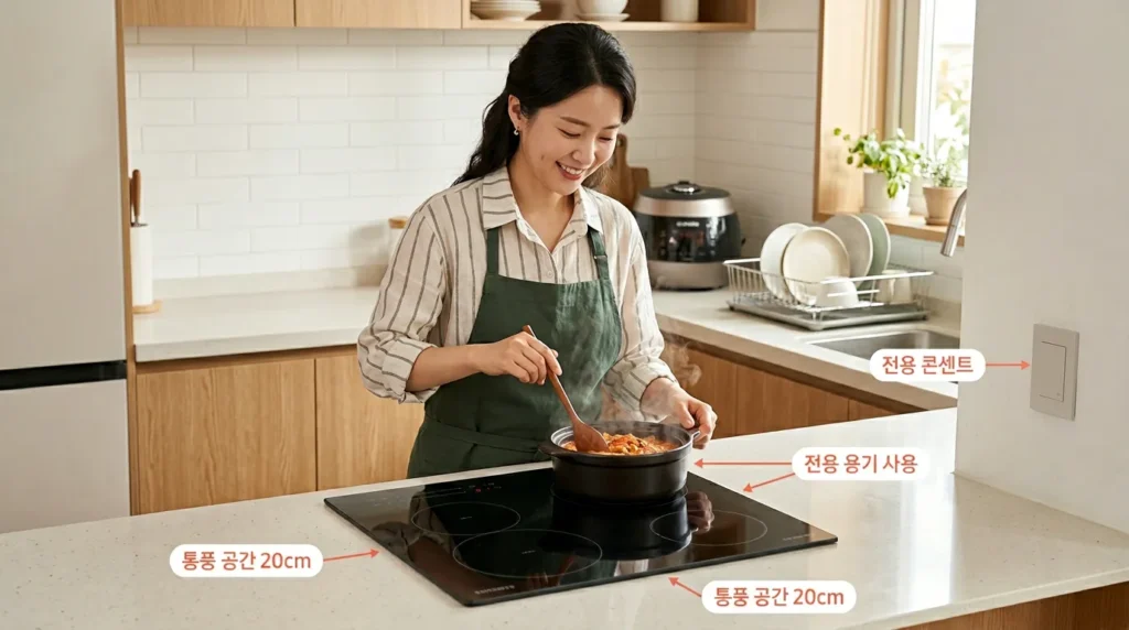 환기: 인덕션 하부 통풍구 주변 20cm 이상 공간 확보
