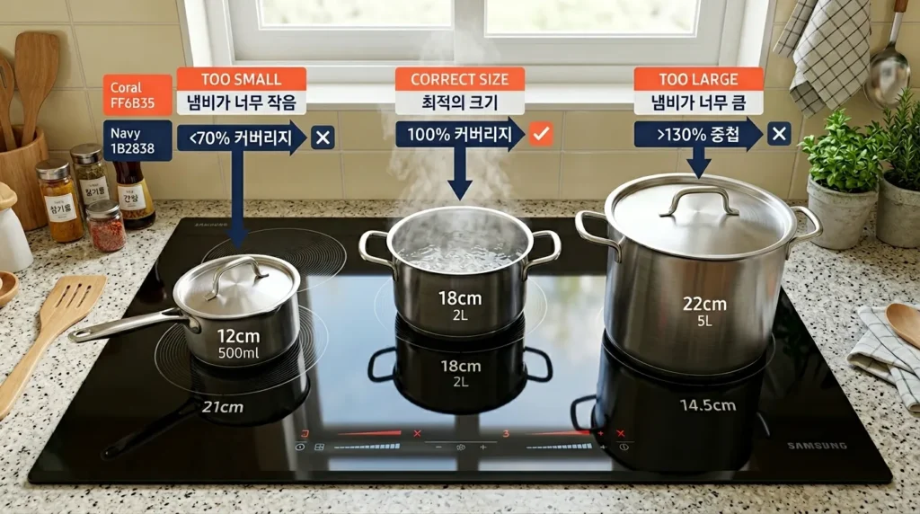 📐 원인 2: 냄비 직경이 화구 크기의 70% 미만 또는 130% 초과 — 크기 불일치가 의외로 흔한 원인이에요.