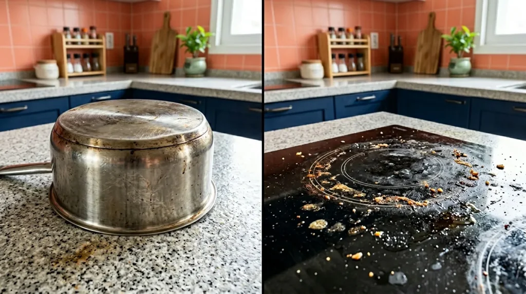 🔧 원인 3: 냄비 바닥 변형 또는 상판 오염 — 볼록하게 휜 냄비는 센서가 감지 못해요.